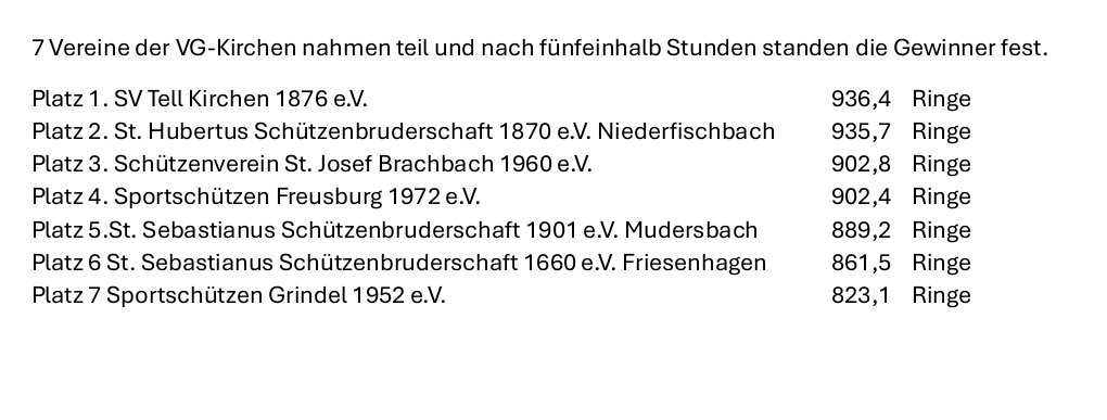 Beim diesjährigen Vogelschießen, am 07.07.2025, im Schützenverein SV TELL Kirchen, traten 24 Schützen/innen an, um die Insignien für sich zu behaupten. Als der Vogel "gerupft" war, ging es weiter. Beim anschließenden "Vogel frei", in dem um die Königswürde geschossen wurde, konnte sich Astrid Brockelt gegen ihre 11 Kontrahenten erfolgreich durchsetzen und wurde somit die neue Tell Königin 2025.